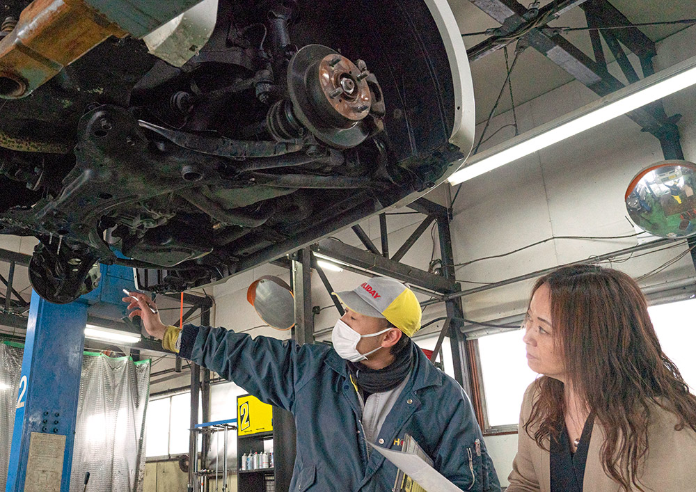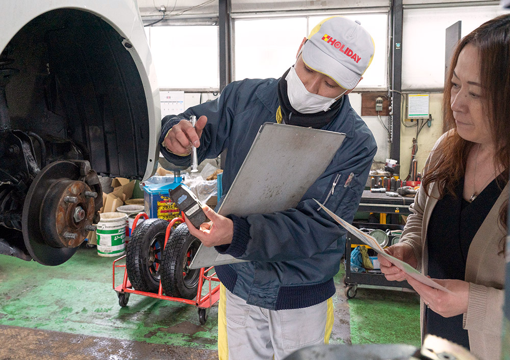 お客様立会いのもと、整備士が部品の消耗具合などをチェック。